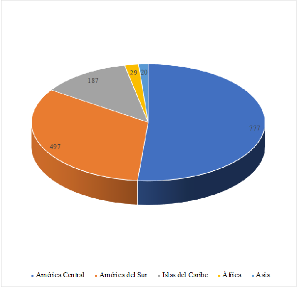 El Valle de Chalco de acuerdo a los datos proporcionados por la Unidad de Política Migratoria de nuestro país sostiene que de los más de cinco mil migrantes de esta categoría registrados por dicha institución, detectados en la entidad, 1,510 personas fueron presentadas ante la autoridad migratoria el Valle de Chalco. Se destaca la mayor presencia de aquellos que provienen de Centroamérica, América del Sur, Islas del Caribe, África y Asia (Figura 6).