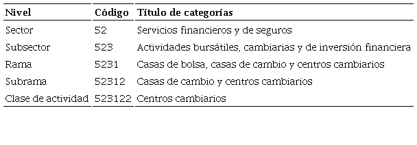 A pesar de esto, se tomaron como referencia las siguientes dos definiciones del SCIAN y se compararon las 304 ramas y subramas de actividad económica en México de acuerdo con este sistema elaborado para México, Estados Unidos y Canadá. La primera definición es la siguiente: