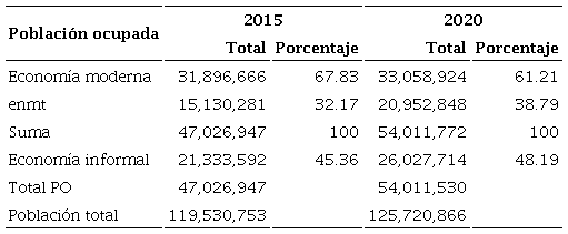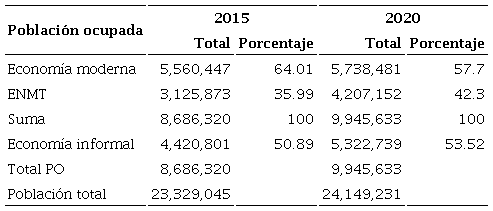 Entre 2015 y 2020, el empleo en el sector no moderno de la economía del país experimentó un incremento de 6.7 por ciento. Esta tendencia ha evidenciado una persistente dualidad económica en los últimos cinco años. Sin embargo, las estadísticas del año 2020 se vieron parcialmente afectadas por el confinamiento derivado de la pandemia, lo que impidió el crecimiento esperado en las economías no moderna e informal.