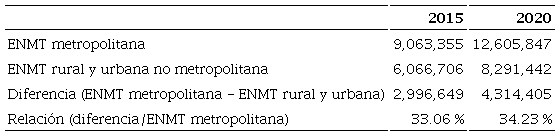 Las cifras de la Tabla 4 revelan una realidad contundente: el número de personas empleadas en la ENMT y la economía informal supera con creces la población total de habitantes urbanos y rurales no metropolitanos. Esta disparidad evidencia la concentración de este tipo de economía en las metrópolis, abarcando una gran parte de la economía informal. Un dato relevante del cuadro es que, en 2020, las metrópolis del país contaban con 12,605,847 personas empleadas en la ENMT, mientras que en todo el país la cifra ascendía a 20,952,848, lo que confirma la dualidad económica en las metrópolis. Se presume que, en estos centros urbanos, los excedentes de la economía moderna, sumados a los inmigrantes de áreas rurales y no rurales, encuentran más oportunidades o lugares propicios para establecer pequeños negocios o trabajar por cuenta propia. Es probable que para los inmigrantes estas oportunidades sean más accesibles que en sus lugares de origen.