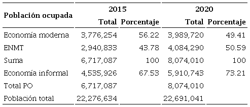 Resulta interesante también el ligero incremento observado en la economía moderna, en la ENMT y en la economía informal durante los cinco años estudiados. El crecimiento de la economía moderna fue de 3.5 por ciento, el de la ENMT alcanzó 27.79 por ciento y el de la economía informal llegó a 18.04 por ciento, mientras que el crecimiento de la población ocupada fue de 12.93 por ciento. En otras palabras, tanto la informalidad como la ENMT crecieron de manera proporcionalmente mayor que la población ocupada total durante el periodo analizado.8