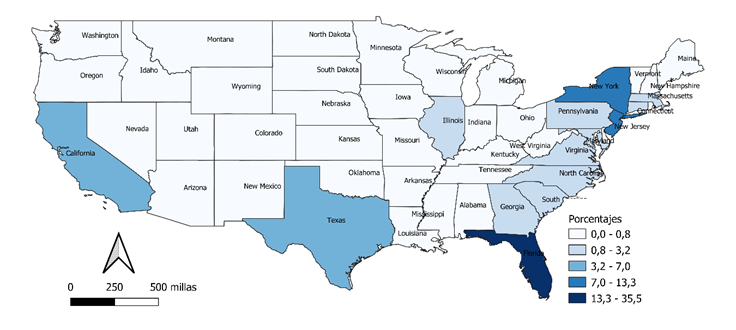 El análisis de la distribución regional de los migrantes colombianos en los Estados Unidos, a través de la Encuesta de la Comunidad Americana-American Community Surveys (ACS) proporcionada por IPUMS USA, muestra que, aunque existen varios estados receptores de inmigrantes, la población colombiana se concentra en unos pocos. La distribución geográfica por umbrales naturales se puede observar en el Mapa 1 donde el color azul más intenso indica una mayor cantidad de población colombiana. Florida es el principal destino de la población inmigrante colombiana, comprende 35.5 por ciento de ella, seguido de Nueva York con 13.3 por ciento, Nueva Jersey con 10.2 por ciento, California con 6.9 por ciento y Texas con seis por ciento de participación respectivamente.