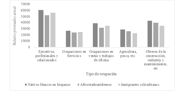 Por otra parte, si se desagrega por ocupaciones, se tiene que aquellos que se ocupan como ejecutivos, profesionales y relacionados son los que obtienen mayores salarios anuales. Los nativos blancos no hispanos reciben el salario promedio anual más alto para todos los tipos de ocupaciones. Este grupo recibe en promedio un salario de 79,601.6 dólares anuales desempeñándose como ejecutivos y relacionados. Mientras que el salario más bajo lo obtienen los inmigrantes colombianos ocupados en agricultura, pesca, y demás, al recibir en promedio 22, 536.9 dólares.