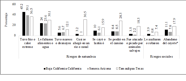 En la última década dos de las regiones de cruce de mayor violencia y riesgos mortales para los migrantes fueron Sonora-Arizona y Tamaulipas-Texas. El cruce clandestino por el desierto de Sonora-Arizona cobró relevancia desde los primeros años del siglo XXI (Anguiano, 2015) tras el creciente aumento de las muertes de migrantes derivadas de los riesgos de naturaleza al cruzar el desierto (Martínez et al., 2014; Meneses, 2013), y las violencias durante el cruce perpetradas tanto por las bandas de delincuentes (bajadores) que en el camino roban, asaltan, secuestran o violan a migrantes, así como por las organizaciones del narcotráfico que cobran a estos derecho de piso a cambio del tránsito libre por la ruta, o bien les exigen transportar mochilas con droga (Slack y Whiteford, 2010).