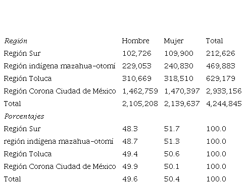 En México hay 31 millones de jóvenes de 15 a 29 años; reconocidos como parte del bono demográfico; en el Estado de México son 4.2 millones de jóvenes, de los cuales 49 por ciento son varones y 51 por ciento, mujeres, en 2020. A nivel regional, el mayor tamaño absoluto se concentra en los municipios metropolitanos colindantes con la Ciudad de México y Toluca (Cuadro 1). Los de menor tamaño son la región del sur y noreste del Estado de México, reconocido el primero como de tradición migratoria internacional y el segundo con mayor representación de hablantes de lengua indígena, principalmente por mazahuas y otomíes. En términos porcentuales, en mayor medida es mayor para el caso femenino en todas las regiones con relación a la proporción masculina. Sin embargo, se destaca el caso de la zona metropolitana de la Ciudad de México, cuya distribución porcentual es muy parecida para ambos sexos. Dicha distribución porcentual expresa la demanda potencial de bachillerato y licenciatura a nivel regional de la entidad.