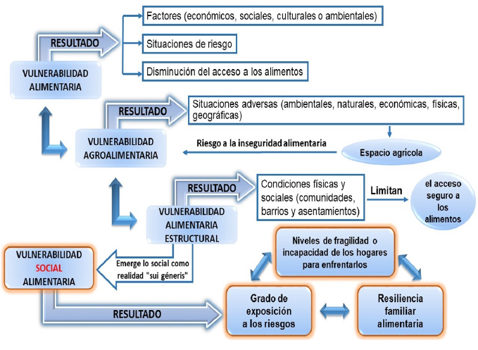Esta representación conceptual conlleva reconfigurar la postura analítica sobre la vulnerabilidad como un espacio complejo de producción de situaciones alimentarias adversas y extremas construidas de la interconexión e interrelación de factores macro y micro sociales. De ahí que “lo social” se constituya en un fundamento básico para comprender las diversas formas estructurales que cambian o transforman ese entramado simbólico familiar, constituido por las relaciones de consumo y el acceso a los alimentos.