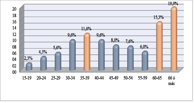 Atendiendo a la primera perspectiva, los rangos de edades predominantes en las familias encuestadas se ubican en: 35-39 (11.6 por ciento), 60-65 (15.3 por ciento) y 66 o más (19.9 por ciento) (Figura 3).