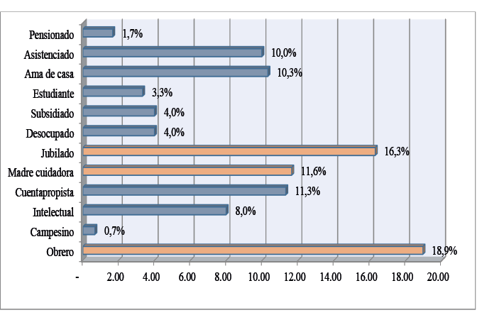Estos dos últimos rangos demuestran la tendencia al envejecimiento poblacional presentes en muchos hogares cubanos a partir del aumento de personas mayores. Dicho grupo social requiere no solo de atención en materia económica, de salud, bienestar psicológico, físico y de socialización, asistencia de movilidad, fomento de capacidades, planificación patrimonial, sino también de un mayor cuidado alimentario. En este sentido, los datos obtenidos revelan entre las ocupaciones más significativas a la madre cuidadora (11.6 por ciento), que ocupa el tercer lugar respecto al obrero (18.9 por ciento) y los jubilados (16.3 por ciento) en la muestra encuestada (Figura 4).