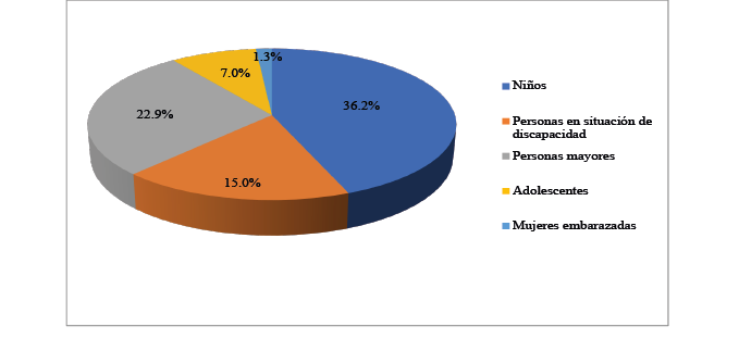 Por otra parte, el trabajo no remunerado que realizan las mujeres en función del cuidado incrementa la vulnerabilidad social de éstas, pues junto al envejecimiento (22.9 por ciento cuidan a personas mayores), se suma el tiempo dedicado a la atención de niños (36.2 por ciento), personas en situación de discapacidad (15 por ciento), adolescentes (siete por ciento) y embarazadas (1.3 por ciento) (Figura 5).