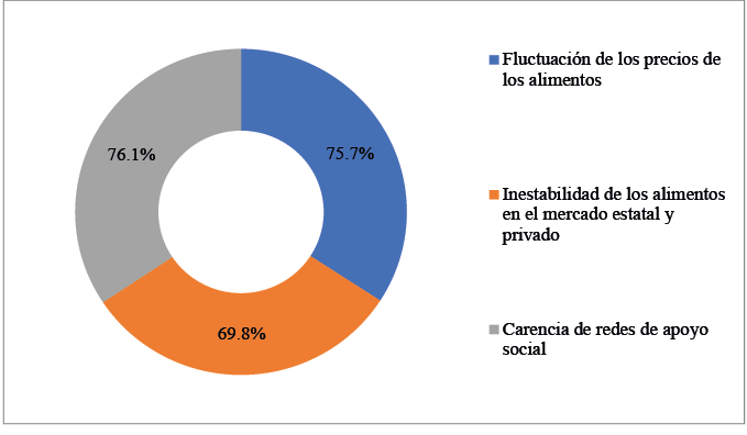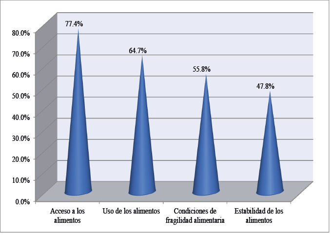Dentro de este marco de la vulnerabilidad social alimentaria, la exposición de las familias estudiadas a situaciones de riesgo también está relacionada por el acceso (77.4 por ciento), la utilización (64.7 por ciento), las condiciones de fragilidad alimentaria (55.8 por ciento) y la estabilidad de los alimentos (47.8 por ciento) presentes en dichos hogares (Figura 6). Todos ellos expresaron conflictos derivados de la pasada pandemia Covid-19, la situación inflacionaria, los vaivenes de la economía cubana y las carencias todavía existentes en los sistemas alimentarios locales respecto a la producción, elaboración, distribución y comercialización de los alimentos.
