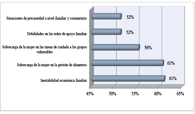 Vinculado a estos riesgos, se encuentra la fragilidad o incapacidad de los hogares para enfrentarse a las problemáticas derivadas de la actual crisis alimentaria. A partir de este escenario, dichas fragilidades se construyen en un entramado familiar donde subyacen inestabilidades económicas (61.1 por ciento), sobrecarga de la mujer en la gestión de alimentos (60.8 por ciento) y el cuidado (55.5 por ciento), debilidades en las redes de apoyo familiar (51.5 por ciento) y situaciones de precariedad (51.5 por ciento) (Figura 7). Esta característica visibiliza las fisuras en las relaciones familiares para solventar necesidades y preferencias alimentarias, atendiendo a los recursos o activos que movilizan estos hogares en materia de seguridad alimentaria.