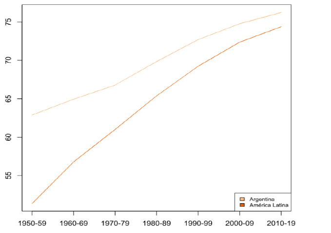 Durante el periodo 1950-2019, la región de América Latina y el Caribe aumentó su EVN en 23.1 años, reduciendo la brecha con Europa y América del Norte a 4.8 años. Esto puede deberse a que las regiones con altos niveles de mortalidad tienen la posibilidad de recibir tecnología sanitaria de aquellas regiones con bajos niveles de mortalidad. En consecuencia, la EVN en las primeras aumenta más rápidamente que en las regiones desarrolladas, debido a la notable reducción de la mortalidad en las primeras etapas de la vida, especialmente durante la infancia y el nacimiento. En Argentina en particular, la EVN se ha posicionado por encima del promedio de América Latina desde mediados del siglo XX, alcanzando los 76 años entre 2010 y 2019 (Figura 1).