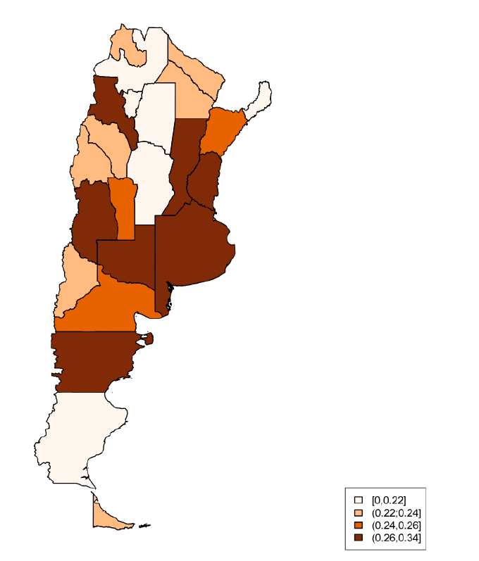 Sin embargo, la definición de economía plateada adoptada por la Comisión Europea es la de Oxford Economics (European Commission, 2015) y considera el umbral de los 50 años para clasificar a la generación joven de la generación plata. Por ello, cabe preguntarse cómo ha evolucionado la proporción de personas de 50 años o más en Argentina entre los dos últimos censos de población (2010-2022). En la Figura 2 se muestra a qué cuartil de la variable proporción de personas de al menos 50 años pertenece cada jurisdicción de Argentina según los datos del último Censo Nacional de Población realizado por el INDEC.