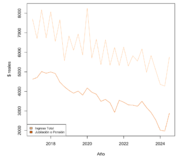 En la Figura 3 se muestra la evolución entre 2016 y 2024 del ingreso individual medio total de las personas de 50 años o más en Argentina, así como la parte de ese ingreso que proviene de pensiones, según datos de la EPH. Para corregir los valores nominales se utilizó el IPCN publicado por el INDEC con base 100 a diciembre de 2016; es decir, los valores están expresados en pesos constantes de diciembre de 2016. Finalmente, los valores están ponderados por la cantidad de personas que representa cada encuestado a nivel nacional.