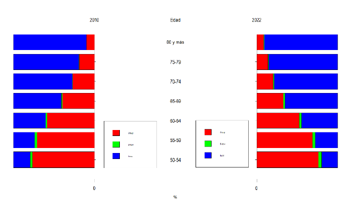 Aunque el número de personas de 50 o más años aumentó 26.8 por ciento entre 2010 y 2022, la proporción de personas ocupadas disminuyó en todos los grupos de edad, mientras que la proporción de desempleados e inactivos aumentó (en el grupo de 50 a 54 años solo aumentó la proporción de desempleados, mientras que la proporción de personas ocupadas e inactivas disminuyó). Esta situación pone en duda la posibilidad de elevar la edad mínima de jubilación como posible solución a los desafíos económicos del envejecimiento poblacional (tanto desde una perspectiva tradicional que se adhiere al modelo del ciclo de vida como desde la perspectiva del nuevo paradigma de la economía plateada). Si las personas que se incorporan a la generación plateada sufren cada vez más el desempleo (buscan trabajo y no lo encuentran), una mayor oferta laboral solo empeorará esta situación.