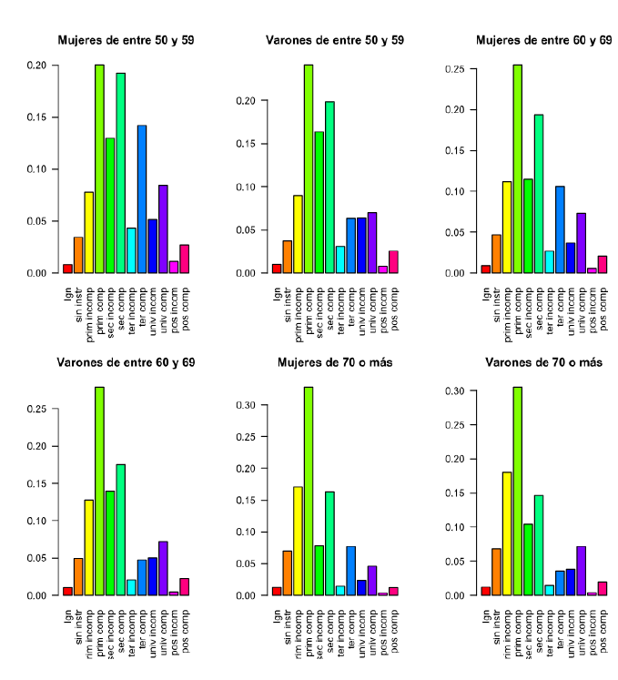 En este sentido, cobra relevancia estudiar el nivel de calificación de las personas mayores según género y grupo etario. La Figura 5 muestra cómo se distribuyen las personas mayores según nivel educativo máximo alcanzado, género y grupo etario. Se encuentra que hasta los 69 años la mayor concentración de personas de ambos sexos se da en secundario completo o incompleto. A partir de los 70 años se observa mayor frecuencia relativa en primario completo o incompleto, indicando que las nuevas generaciones alcanzaron niveles más altos en promedio, lo que también se verifica al examinar la proporción que alcanzó estudios superiores terciarios o universitarios entre personas de 50 a 59 años (32 por ciento mujeres y 22.7 por ciento de varones) comparado con esa misma proporción entre personas de más de 70 años (16 por ciento tanto mujeres como varones). Esto último nos habla además de una brecha de género a favor de las mujeres en términos educativos para las generaciones más jóvenes. Esto es importante en tanto oferta laboral potencial de estas personas, así como también en tanto consumidores con un perfil de mayor nivel educativo.