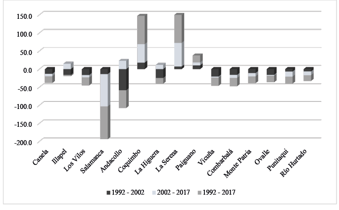 En paralelo a las presiones territoriales generadas por la minería en la región, se observa la pérdida de población rural constante en ocho comunas durante los tres últimos periodos censales (Figura 2). En Illapel, Andacollo, Salamanca y La Higuera se presentaron descensos entre 1992-2002 y aumentos entre 2002-2017, pero en el periodo largo (1992-2017) tuvieron saldo negativo al no poder equilibrar el registro demográfico de 1992 (Figura 2). Mientras que, Coquimbo, La Serena y Paiguano presentaron incrementos de población constante en los tres censos analizados (Figura 2).