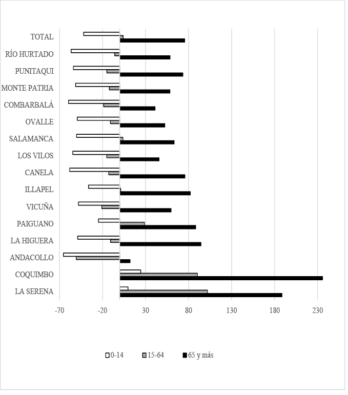 Además, las pérdidas de población rural se hacen más evidentes por grandes grupos de edad, donde salvo La Serena y Coquimbo, todas las comunas perdieron población rural, siendo el sector de 0-14 años el de mayor impacto. El registro más leve es de -24.6 por ciento (Paiguano) y el más drásticos es de -65.3 por ciento (Andacollo) precisamente donde hay una mina a cielo abierto (Figura 3). El rango de 15-64 años muestra que 66.6 por ciento de las comunas analizadas presentó declive demográfico, donde Andacollo también presenta el dato más drástico con -50.5 por ciento, (Figura 3), lo que indica que en esa comuna la población rural experimentó fuertes cambios demográficos en los últimos treinta años. En contraste, toda la región de Coquimbo tuvo incremento de población en el rango de 65 años o más, denotando una tendencia al envejecimiento de las zonas rurales (Figura 3).