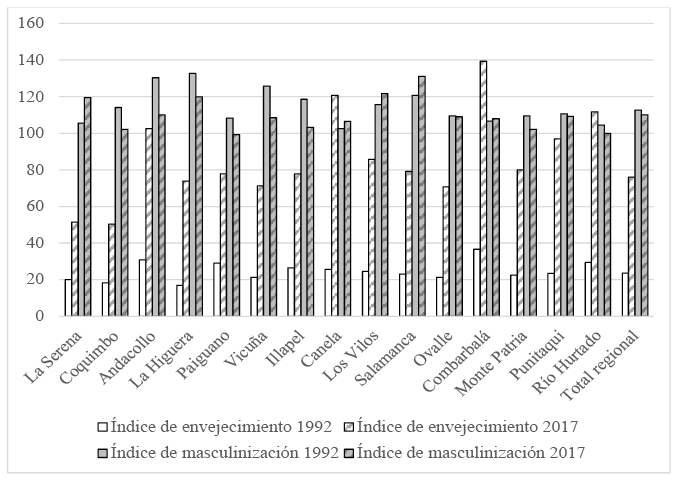En 1992 el índice de envejecimiento de la población rural en Coquimbo era relativamente bajo para todas las comunas, pero este se incrementó drásticamente en 2017, corroborando el tránsito hacia el envejecimiento rural de la región (Figura 4). Las comunas de La Serena (51.41) y Coquimbo (50.39) tienen los datos más bajos, mientras que Combarbalá (139.45) y Canela (120.76) tienen los datos más altos (Figura 3). De manera inversa, la masculinización característica en Coquimbo en el censo de 1992 disminuyó para 2017, reduciendo el desequilibrio por género, aunque los datos siguen siendo elevados (Figura 4). Por ejemplo, Salamanca (131.01), Los Vilos (121.72) y La Higuera (119.84) mantienen registros muy fuertes de masculinización rural en sus territorios (Figura 4).