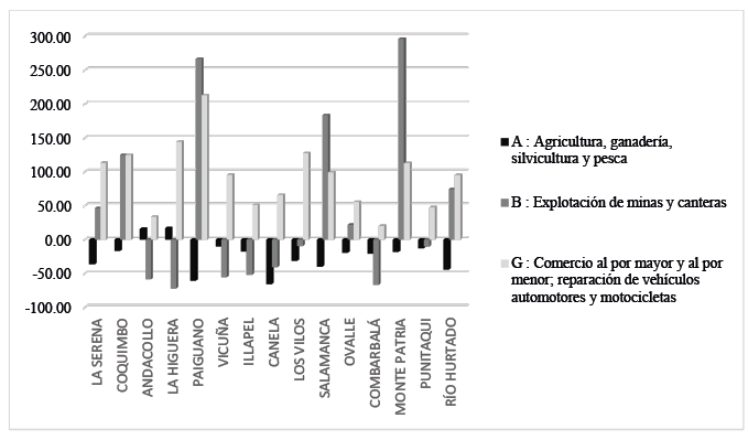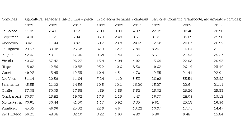 El análisis muestra la pérdida de empleos en actividades primarias y la pérdida de importancia de estas actividades en la economía local de las comunas de la región de Coquimbo. En Andacollo y La Higuera se observa que a la par del descenso de la minería hubo un aumento de empleos en las actividades primarias, sin embargo, las actividades que más crecimiento porcentual tuvieron por empleo, son el comercio, transporte, alojamiento y servicios de comidas, demostrando un comportamiento particular, sobre todo en la Higuera, en que los sectores de servicios crecieron abruptamente. Es probable que esto se deba a un repunte del turismo; mientras que, en cuanto a las actividades primarias, quizás se debe a la lucha de los pescadores artesanales por mantener esa práctica tradicional de sustento.