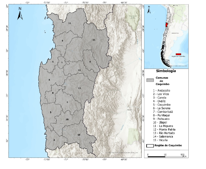 La Región de Coquimbo se localiza en el norte de Chile y cuenta con tres provincias (Choapa, El Elqui, Limarí), quince comunas (Figura1) y la capital regional es la ciudad de La Serena. Según el Censo de Población de 2017 tiene 757,586 habitantes (INE, 2017), con una variación positiva de 25.59 por ciento y 50.20 por ciento con respecto a los censos de 2002 y 1992, respectivamente (INE, 1992; 2002). La población se concentra en zonas urbanas con 81.19 por ciento, mientras que la población rural pasó de representar 29.52 por ciento en 1992, a 21.93 por ciento en 2002 y 18.81 por ciento en 2017 (INE, 1992; 2002; 2017). Lo que se traduce en pérdida de población rural de -4.45 por ciento entre 1992 y 2017, descendiendo de 149,103 habitantes a 142,470 habitantes (INE, 1992; 2017).