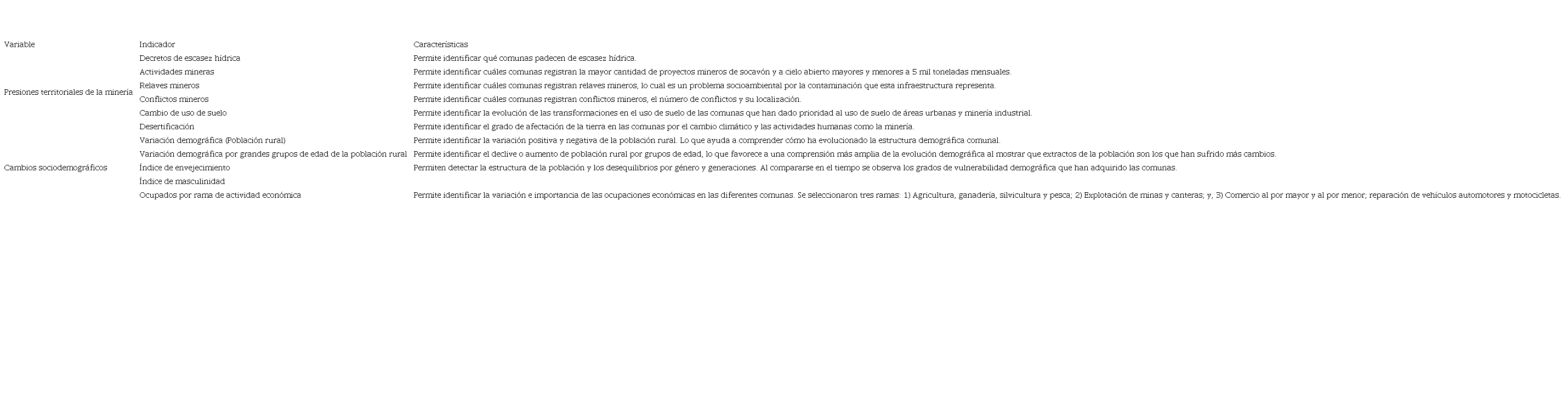 Es un estudio exploratorio que utilizó estadística descriptiva y la revisión de documentos académicos y técnicos sobre despoblamiento rural y minería. El procedimiento metodológico inició con la definición de las variables y las unidades de análisis tomando como pauta la discusión de literatura científica en la sección teórica (Tabla 1), luego se recolectó la información, se prepararon las bases de datos y después se llevó a cabo el análisis, para finalmente presentar los resultados con el apoyo de tablas y gráficos.