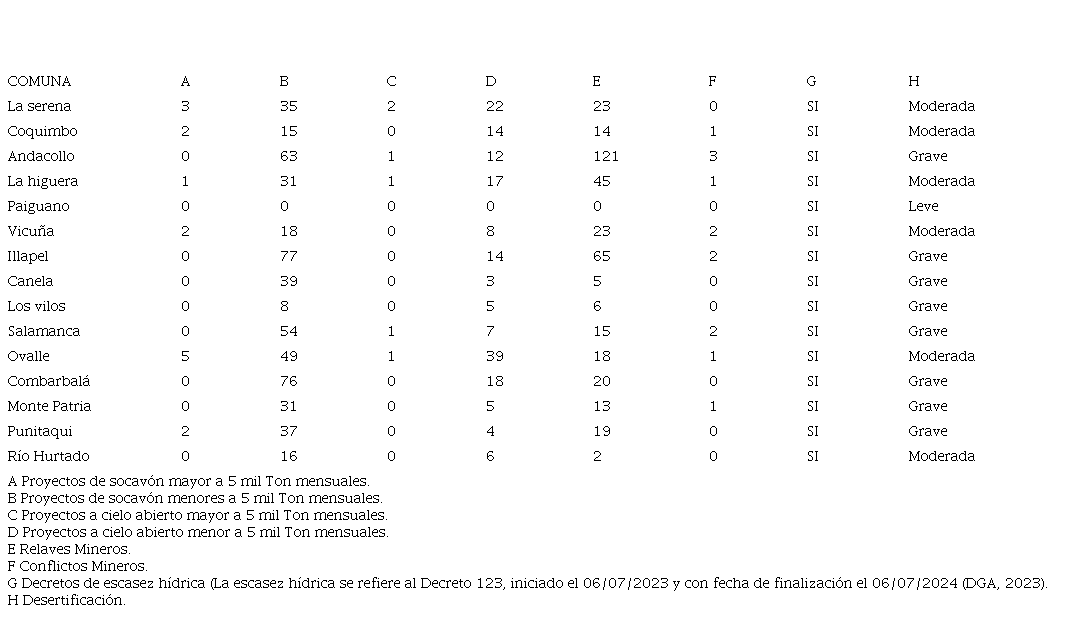 El despliegue de actividades mineras en la región de Coquimbo y los cambios de uso de suelo se asocian a los problemas coyunturales de escasez hídrica. En todas las comunas este problema tiene presencia, probablemente debido a la tradición extractiva de la zona, lo cual pudo haberse exacerbado con los cambios en los métodos de extracción al ingresar la minería a cielo abierto que requiere de más recursos hídricos y que suma seis proyectos a gran escala y 174 en menos escala distribuidos en toda la región, a excepción de Paiguano (Tabla 2).