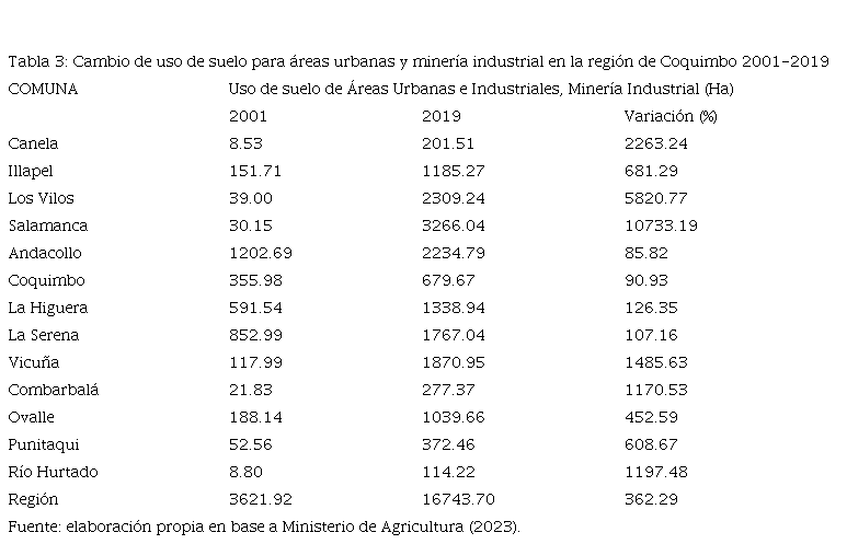 En veinte años, la expansión de las áreas urbanas e industriales que integran el uso para minería industrial generó cambios en el uso de suelo a escala regional, pasando de 3,621.92 ha a 16,743.70 ha entre 2011 y 2019 (Tabla 3). En todas las comunas, excepto Paiguano que no cuenta con este uso de suelo y Monte Patria que no tiene datos para 2001, también se registraron cambios importantes en el mismo periodo de tiempo (Tabla 3). El caso más extremo fue Salamanca (10,733.19 por ciento), que pasó de 30.15 ha a 3,266.04 ha, siendo la comuna con la mayor cantidad de hectáreas destinadas a este uso de suelo (Tabla 3). Otras comunas con fuertes cambios de uso de suelo para minería industrial fueron Los Vilos, Vicuña, Ovalle, Illapel, Andacollo, La Serena y La Higuera.