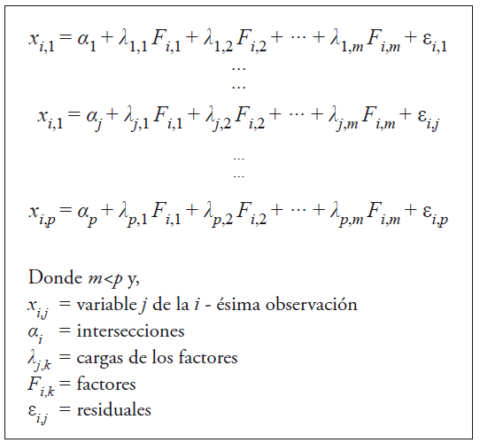 El análisis se realizó para los años 2008, 2010 y 2012 y se divide en tres etapas. La primera consiste en un Análisis Factorial Confirmatorio (afc) para corroborar que la hipótesis sobre la circulación de dos monedas o recursos clave para el intercambio de dos tipos de ayuda es correcta. El afc permite someter a prueba que las observaciones provienen de variables latentes que se pueden identificar a través de las covarianzas entre las variables observadas. 9 El afc se centra únicamente en el modelo de medición. Una vez hecho el análisis contaremos con los puntajes para cada factor. Dichos puntajes servirán de insumo para la construcción de las diferentes clases de hogares (en tanto sus capacidades para acceder al intercambio de favores). Una vez cumplido el análisis exploratorio sobre el número de factores a los que se puede reducir la dimensionalidad de un conjunto de variables, se desarrolla el siguiente sistema de ecuaciones en términos de dichos factores para cada observación.