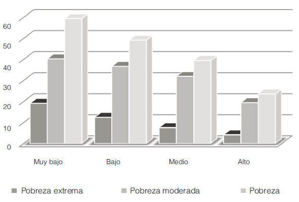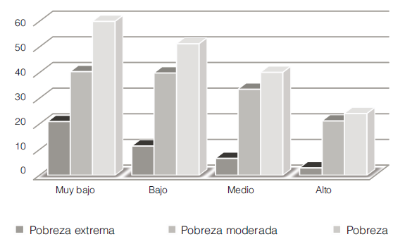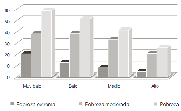 Analizados los indicadores de carencias sociales e ingreso por separado, lo que resta es averiguar la relación entre el nivel de pobreza y el grado de confianza. El análisis indica que a menor pobreza el grado de confianza aumenta. Este comportamiento se observa para los tres tipos de pobreza, la total, la moderada y la extrema. Sin embargo, parece haber menores saltos, dependiendo del grado de confianza, para los denominados pobres moderados, es decir aquellas personas que no son pobres extremos, pero son pobres.