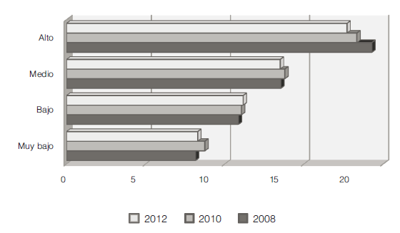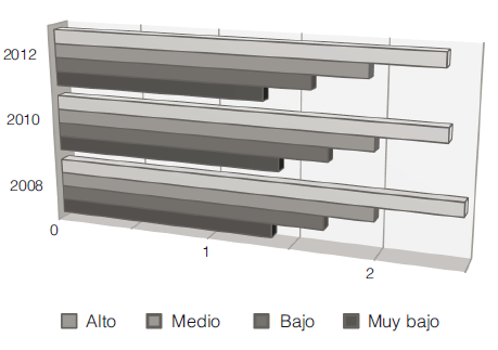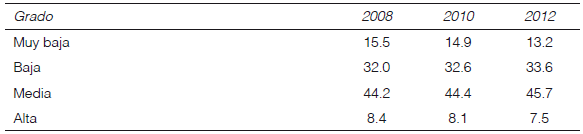 En el cuadro 7 podemos observar cómo se distribuye la población a lo largo del periodo comprendido entre 2008 y 2012 de acuerdo a su grado de confianza en el acceso a los favores. Dado que la estimación del grado de confianza es de corte transversal no es correcto hacer una comparación a través del tiempo, pues el grado de confianza en cada año depende de la distribución para dicho año de las seis preguntas sobre redes sociales.