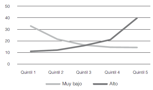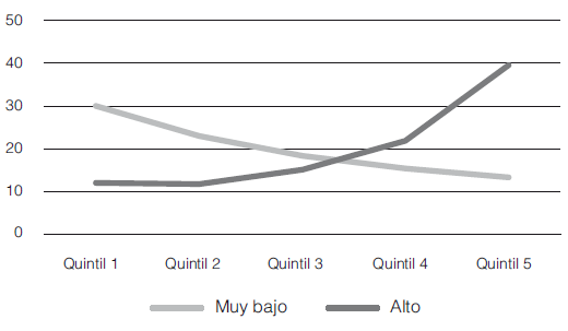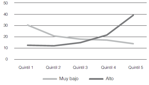 Para los hogares con grado de confianza alto, el porcentaje mayor se presen- ta en el quintil con mayores ingresos, mientras que para los hogares con grado de confianza muy bajo pasa lo contrario, el mayor porcentaje se concentra en el quintil con menores ingresos laborales.