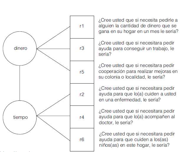 El modelo factorial confirmatorio contiene dos variables latentes: dinero, que se mide a través de las variables manifiestas r1, r3 y r5, y tiempo, que se mide a través de r2, r4 y r6. El afc mide con cierto grado de error dichas dimensiones (indicadas con ei). Asociados al dinero están los préstamos monetarios, las contribuciones en efectivo para realizar mejoras en el entorno y la ayuda para conseguir un trabajo. Con la variable latente tiempo están relacionadas las preguntas que indagan sobre el acceso a ayuda para el cuidado en una enfermedad, compañía para ir al doctor y para cuidado de los menores en el hogar.