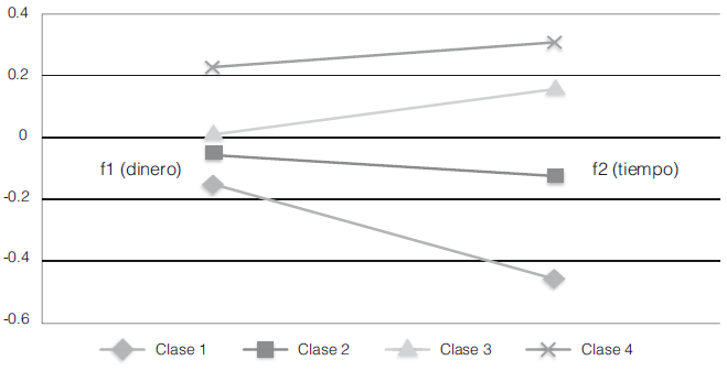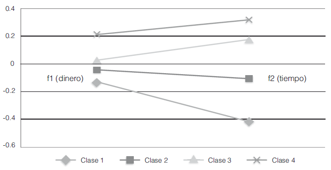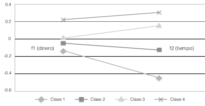 Con base en estas medidas, se puede concluir que el número óptimo de clases para clasificar el grado de confianza es 4 para los tres años. En los gráficos 2, 3 y 4 se muestran las proporciones de los factores asociados a redes de dinero y tiempo según la clase a la que pertenece. Es importante recordar que el grado de confianza clasifica a los hogares, por lo tanto, todas las personas pertenecientes a un hogar comparten la misma clase, es decir, el mismo grado de confianza. Los puntajes de los factores son menores en la clase 1 que en la clase 2; los de la clase 2 son menores que los de la clase 3, y los de la clase 3 son menores que los de la clase 4. La clase 4 es la de mejor o mayor percepción sobre su acceso a los favores/ayudas. Dicho de otra forma, es la clase de hogares con mayor grado de confianza. En contraste, la clase de hogares 1 es la que goza de menor grado de confianza.