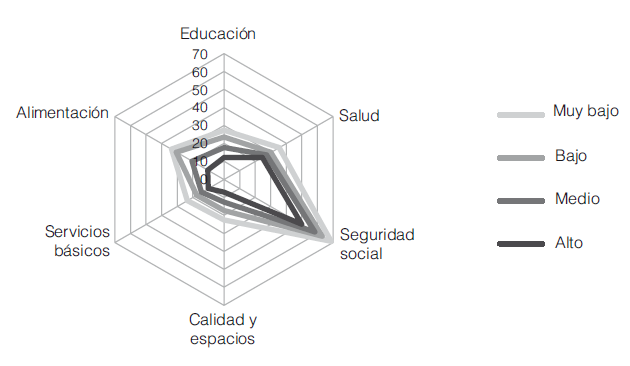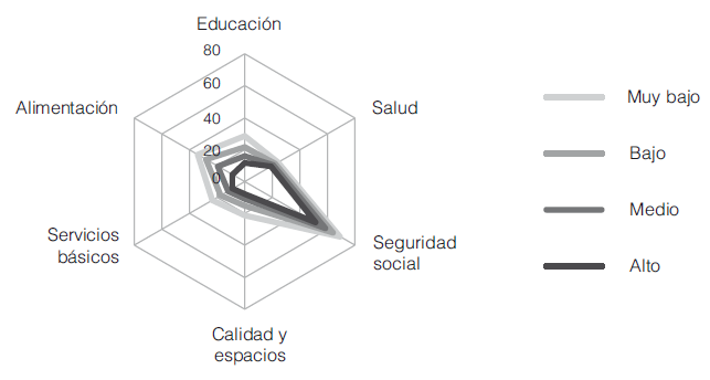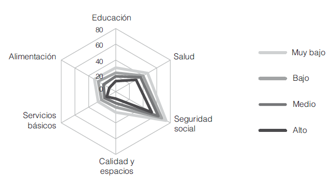 La medición oficial de la pobreza en México es multidimensional y considera que una persona es pobre si su ingreso se encuentra por debajo de la línea de bienestar (que corresponde a la suma de los valores de la canasta alimentaria más la canasta no alimentaria) y cuenta con al menos una carencia social. Las carencias sociales responden a carencias en derechos sociales establecidos en la Ley General de Desarrollo Social (lgds): educación, acceso a servicios de salud, acceso a la seguridad social, calidad y espacios de la vivienda, servicios básicos en la vivienda y acceso a la alimentación. Una persona es pobre extrema si su ingreso se encuentra por debajo de la línea de bienestar mínimo (que corresponde al valor de la canasta alimentaria) y cuenta con al menos tres carencias sociales.