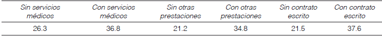 No existe consenso sobre el número y tipo de prestaciones laborales que debe tener un trabajador para ser considerado “cubierto” en cuanto a seguridad social, pero las prestaciones mínimas que se consideran para medir la po- breza son los servicios médicos, la incapacidad con goce de sueldo en caso de accidente, enfermedad o maternidad y el acceso a un sistema de jubilaciones o pensiones para el retiro ( coneval, 2010). Decidimos, con el propósito de observar las diferencias entre los trabajadores según su grado de confianza y sus prestaciones laborales, utilizar otras prestaciones además de las mencionadas. Se consideraron: servicio médico, contrato, incapacidad médica con goce de sueldo, aguinaldo, pensión por invalidez y sar o Afore.