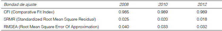 Tanto el rmsea como el srmr son menores a 0.05 y el cfi es bastante alto, de 0.985 o mayor. Con estos resultados contamos con suficiente evidencia para afirmar que nuestro modelo es plausible para los tres años, es decir, que no ha sido rechazado por la evidencia empírica.