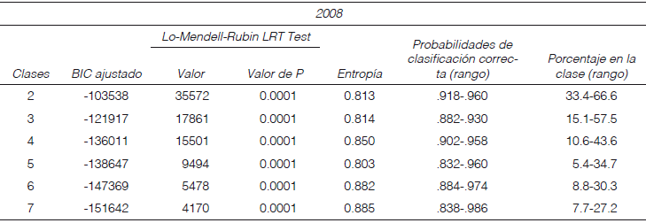 La segunda etapa del análisis es la elaboración de las clases de hogares de acuerdo a los puntajes factoriales. El Análisis de Clases Latentes (acl) permite la formación de tipologías de hogares que son homogéneas dentro de gru- pos, pero heterogéneas entre grupos. La ordenación es paramétrica y tiene la ventaja de que la determinación del número de grupos no es arbitraria, sino que se sujeta a criterios estadísticos (Nylund, Asparouhov & Muthen, 2007; Hagenaars & McCutheon, 2002). Las clases o estratos representan los conjuntos de hogares distintos entre sí, según los distintos grados de confianza que las personas en el hogar tienen de recibir ayuda asociada a las variables dinero y tiempo. Dichos estratos se elaboraron mediante el método de ACL, puesto que, a diferencia de otros métodos de estratificación, éste nos provee de indicadores que permiten determinar el número de estratos. Los modelos de clases latentes suponen que en un conjunto de variables observadas se encuentran varios subgrupos de observaciones que corresponden a diferentes funciones de distribución. El acl sirve para identificar estas funciones de distribución y evaluar la probabilidad de pertenencia de cada observación a cada clase latente. Es importante recalcar que al utilizar el ACL para diferentes muestras, no necesariamente se contará con el mismo número de clases en todos los casos, sin embargo, en el caso de este análisis se encontró, con base en las medidas de ajuste, que el número óptimo de clases para los tres años fue el mismo.