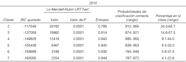 Una vez calculados los puntajes factoriales, nos interesa conocer qué tipo de hogares tienen los puntajes más altos y los puntajes más bajos para determinar el grado de confianza en el acceso a los recursos que circulan en las redes, para después analizar si los distintos grados de confianza están relacionados con el nivel de ingreso y el tipo de empleo/ocupación. Nos interesa averiguar, además, si el hecho de que los hogares sean o no pobres impacta el grado de confianza de sus miembros para determinar si se observa la relación esperada entre empleo precario, pobreza, ingreso y otras variables asociadas a carencias sociales con el acceso a redes sociales. Para ello, procedimos a clasificar los hogares en estratos o clases mediante el acl. De este modo obtuvimos una serie de medidas que nos indicaron el número óptimo de estratos. En los cuadros 4, 5 y 6 se muestran las medidas que fueron tomadas a consideración para escoger el número de clases. 10