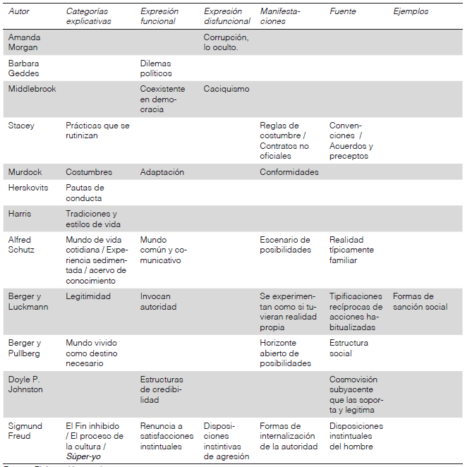 Con la guía de la investigación teórica en tres disciplinas de las ciencias sociales, y buscando rescatar ejes articuladores en los estudios empíricos contemporáneos, se ha intentado aquí recuperar las propiedades observables de las instituciones informales y reducir su equivocidad e indeterminación (Sartori, 2012). Así, la matriz conceptual de la tabla 1 da cuenta de las fuentes más relevantes, mediante el enlace del pensamiento de autores clásicos y contemporáneos con ejes temáticos. Esto permitió concluir, a partir de elementos significativos identificados en la literatura, con una propuesta de los factores o categorías principales para el análisis de las instituciones informales. Es importante agregar que esta propuesta conceptual juega ciertas veces a modo de hallazgos que, sumados a los aportes de estudiosos como Hodgson, Prats Cabrera y O’Donnell, amplían el horizonte de la línea de investigación.