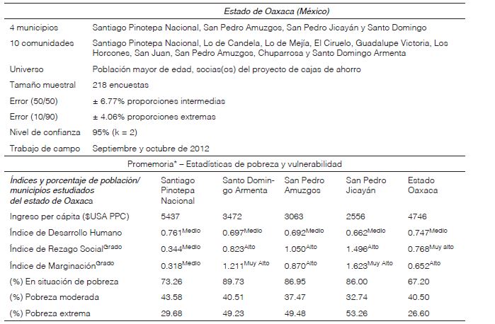 b) Encuestas a socios. Los datos analizados aquí corresponden a los obtenidos con un cuestionario diseñado e implementado por trabajadores de la Fundación entre septiembre y diciembre de 2012. Dicho cuestionario contenía sesenta preguntas, con un primer bloque correspondiente a las características sociodemográficas de los socios y de su unidad familiar (nivel de estudios, edad, sexo, etc.), servicios del hogar y condiciones de vida (tipo de alojamiento, condiciones de habitabilidad del hogar y servicios de los que dispone la unidad familiar), principales fuentes de ingresos y actividad laboral desarrollada por la cabeza de familia, apoyos externos, prácticas agrarias y artesanales, y un último apartado en el que se solicitaba que los encuestados enumeraran los principales problemas de sus comunidades. Los datos obtenidos aportaron valiosa información de las condiciones de vida y niveles de bienestar de los socios de las cajas de ahorro y crédito, comprobándose la vulnerabilidad de la población beneficiaria de esta iniciativa de inclusión financiera. En el cuadro 1 se presenta la ficha técnica de la encuesta realizada, en cuyas últimas filas se aportan estadísticas oficiales —disponibles para los municipios en los que se realizaron las encuestas—, a modo de aproximación a los niveles de pobreza y vulnerabilidad de cada uno de ellos. Se obtuvieron 218 encuestas, en su mayoría con mujeres, socias de cajas de comunidades de diez localidades de cuatro municipios del estado de Oaxaca, lo que determina un error muestral adecuado para este tipo de estudios.