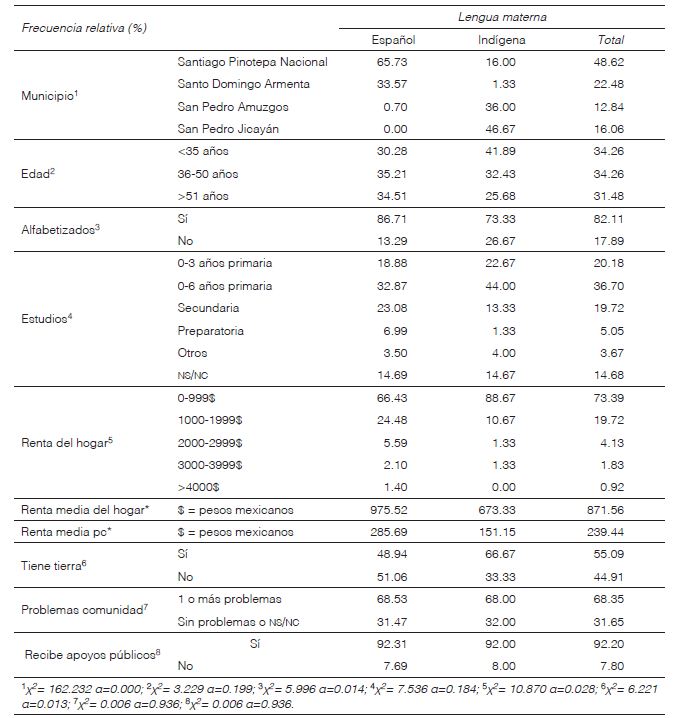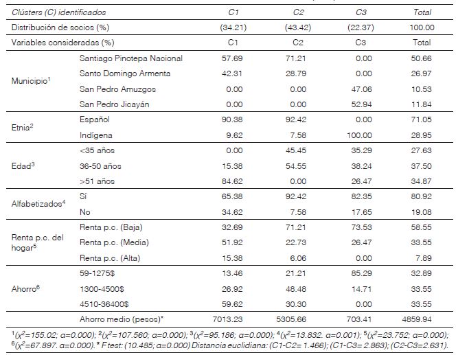 La mayoría de los socios encuestados fueron mujeres (92.20%), en tanto que las lenguas vehiculares más frecuentes fueron el español (65.60%), el mixteco (21.56%) y el amuzgo (12.84%). La clasificación de los socios atendiendo a esta última variable, permitió comprobar diferencias significativas entre los socios.