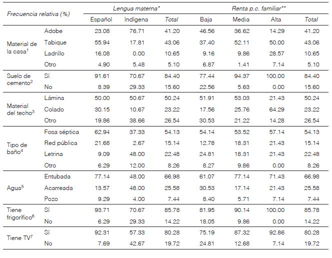De igual modo, la clasificación de la renta per cápita de los encuestados en tres niveles (baja, media y alta), posibilita observar diferencias significativas (α<0,05) entre los socios de las cajas. Así, se comprueba la existencia de una relación significativa tal que, a mayores niveles de renta per cápita se corresponden mejores condiciones de vida debido a más calidad de los materiales de construcción de la vivienda (paredes, suelo y techo), ser receptores de servicios públicos de saneamiento o disponer en el hogar de bienes básicos, como un frigorífico.