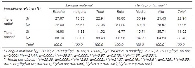 Nuevamente, el origen indígena de los entrevistados identifica peores condiciones de vida ( cuadro 3 ). Así, en este este grupo se halló un mayor porcentaje de hogares con viviendas de peores condiciones (paredes de adobe, suelo de barro y techos de colado), sin servicios públicos (de abastecimiento de agua o de saneamiento), o sin bienes (televisión, radio, coche). Al margen de esas diferencias, cabe recordar las carencias que en general tienen todos los socios de las cajas encuestados, en términos de altos porcentajes, por ejemplo, de viviendas de adobe (41.20%), sin piso de cemento (15.60%), que deben acarrear el agua para consumo en el hogar (25.58%), que carecen de un vehículo (88.48%) o de televisión (19.72%).