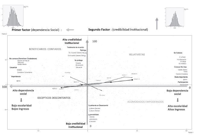 A través del análisis factorial, las variables con más grado de significación terminaron aportando a la construcción de tres factores significativos: a) el denominado dependencia de los programas de protección estatal que señala el grado de adhesión a los subsidios y programas públicos focalizados como estrategia contra la pobreza; b) la aceptación de la protección institucional que señala el grado de confianza y aprecio de las instituciones públicas (nacionales y distritales) que proveen programas y subsidios a los ciudadanos, en general, y a los pobres en particular, y c) el reconocimiento-cumplimiento, tanto de parte del Estado como de los ciudadanos, de un conjunto de deberes y derechos que caracterizan a un Estado social e indica el grado de aceptación de normas ciudadanas, como pagar impuestos y acatar las leyes, pero también el reconocimiento del grado en el que cumplen las autoridades con su función al proteger los derechos de los ciudadanos.