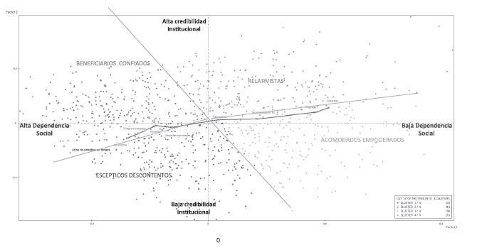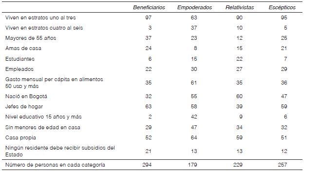 Con la técnica del cluster analysis se identificaron grupos que representaran conglomerados similares en su interior y distintos entre sí. Como se podrá observar más adelante, los cuatro grupos identificados se distribuyeron en un cuadrante que se obtiene con el método afcm en dos direcciones: horizontalmente, de menos a más aceptación del tercer factor; verticalmente, de menos a más, a partir de la consideración de los dos primeros factores. Cada uno de estos grupos de bogotanos comparten opiniones, percepciones y representaciones similares, y tienen condiciones objetivas similares como gasto mensual en alimentos, estrato donde residen, nivel educativo, menores de edad presentes en el hogar, y haber o no nacido en la ciudad. Los grupos se denominaron beneficiarios confiados, empoderados, relativistas, y escépticos descontentos. Se consideró que estos grupos arrojan información figurada sobre los habitantes de Bogotá, a partir de su ubicación socioespacial y de sus representaciones sobre su particular condición social.