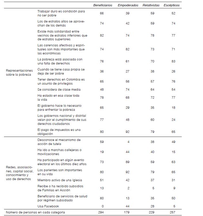 m) En todos los grupos se percibe que los pobres son más solidarios que los que no son pobres. Lo que sí varía por grupos, como se había comprobado en otros estudios, es que se piense, por parte del grupo de los beneficiarios confiados y el de los escépticos descontentos, que los residentes de los estratos más altos se aprovechan de los demás. Esta opinión contrasta con la expresada por el grupo de los empoderados, los que piensan que la condición de aprovecharse de los demás, si se da, es independiente del estrato en el que se vive, es decir, no está determinada por la estratificación de la ciudad.