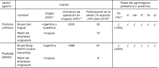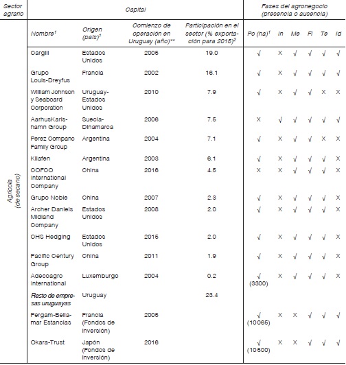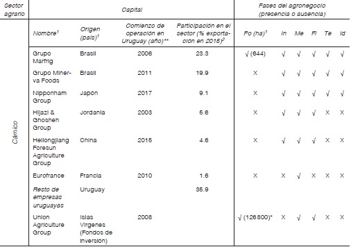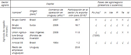 Respecto a las fases del agronegocio, existen cuatro grupos de capital con fuerte presencia en la mayoría de ellas, todos buscando controlar la cadena de valor. En los más de los casos, el capital más importante se concentra en la fase industrial y mercantil con un aporte de alrededor del 36% del total del sector, pero concentrando 14.3% de exportaciones uruguayas en 2015 (Uruguay XXI, 2016a).