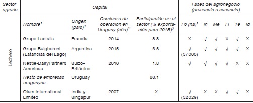 En cuanto al sector lechero (Tabla 2), la situación es muy diferente debido a que la mayor empresa exportadora del país durante los últimos diez años, la Cooperativa Nacional de Productores de Leche (Conaprole), es de capital uruguayo (Uruguay XXI, 2016a). Por ello en este sector hay baja presencia de capitales extranjeros con fuerte inversión en los últimos cinco años. De los cuatro grupos, dos controlan toda la cadena de valor (Grupo Bulgheroni y Nestlé Dairy Partners Americas) y el resto se enfoca a la fase industrial y mercantil (Grupo Lactalis) y exclusivamente productiva (Olam International Limited). Así, se observa una fuerte presencia en las fases industrial y mercantil, en menor medida en lo financiero y tecnológico, y casi nula en programas vinculados a la RSE. Merece un destaque la fase tecnológica, ya que ha habido un aumento sustancial de la productividad debido a que las empresas invierten para mejorarla por hectárea, lo que ha permitido un creciente volumen de exportaciones en detrimento de la disminución de la superficie y del número de vacas.