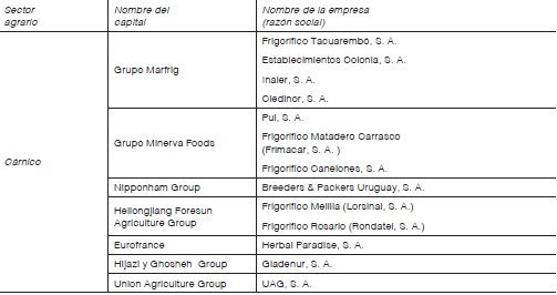 En primer lugar, en el sector cárnico (Tabla 1) se observa alta concentración de capital extranjero -sobre todo en la rama industrial-, con mayor presencia de capitales brasileños que representan el 43.2% del total de las exportaciones del sector. También se evidencian los capitales asiáticos (China y Japón), instalados muy recientemente, en particular el japonés que adquirió Breeders & Packers Uruguay, el más importante frigorífico del país tanto en exportaciones como en cantidad de faena anual (INAC, 2017). Por otro lado, el fondo de inversión Union Agriculture Group es la principal empresa agropecuaria uruguaya con más 85 000 hectáreas gestionadas, tanto en la ganadería como en la agricultura, mostrándose así como una empresa de alta rentabilidad para el inversor, que opera desde las Islas Vírgenes británicas (un paraíso fiscal).